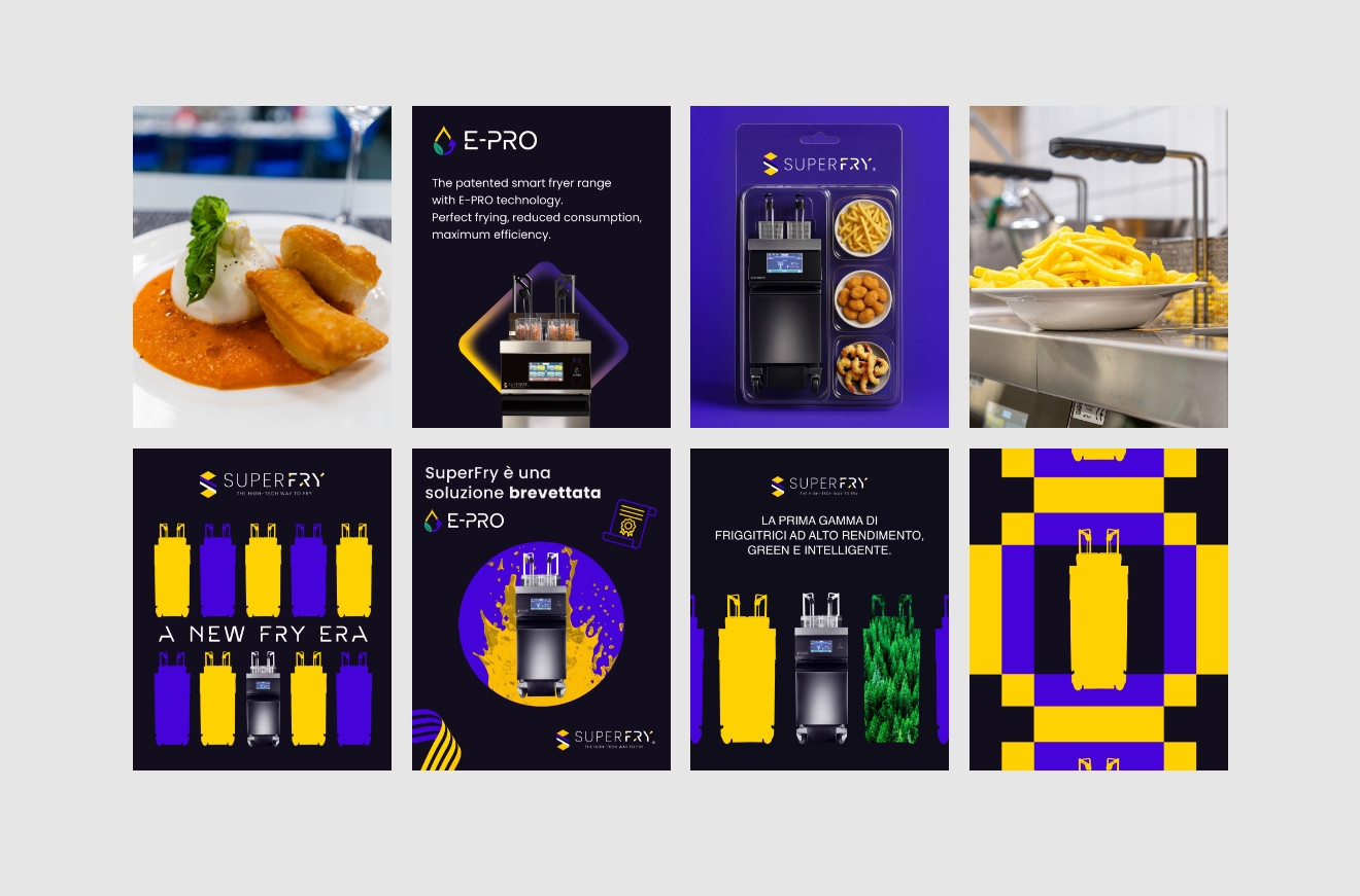 Per il lancio della nuova gamma, abbiamo curato l'intera identità di prodotto: dallo studio del logo e dell'immagine coordinata, al video di lancio e al tutorial di utilizzo, fino al servizio fotografico per catturare funzionalità e design. Il materiale prodotto ha supportato anche la rete di vendita e l'evento di lancio a Host, per il quale abbiamo progettato le grafiche per gli allestimenti fieristici. Ma Host è solo il punto di partenza. Dopo il lancio, la sfida diventa tradurre in linguaggio visivo ciò che SuperFry sa fare sentire. La comunicazione evolve verso uno stile pop e dinamico, in cui ritmo, colore ed energia prendono il posto della scheda tecnica, un mood che si riflette in modo coerente anche nel sito web realizzato per il prodotto.